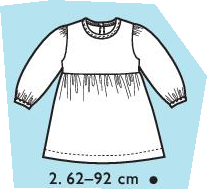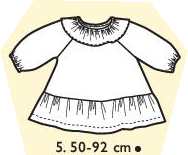 Robe manches longues avec fronces à l’emmanchure et aux poignets. Fronces sur la jupe devant et dos. Bride et bouton pression au dos