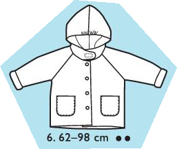 Manteau mi-saison avec capuche froncée sur le haut. Manches raglans, poches plaquées devant, pression devant et velcro pour la capuche.