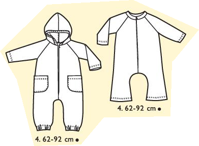 Combinaison manches raglans, fermeture invisible devant. Selon le modèle avec ou sans capuche et avec élastique ou non aux chevilles.
