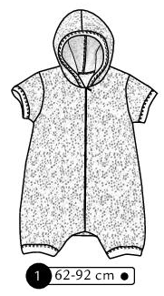 Combinaison courte à manches courtes et capuche. Fermeture invisible devant et bord côte aux manches, jambes et capuche