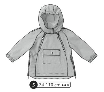 Anorak, veste imperméable à manches raglans et capuche. Poignets élastiqués, un zip de chaque côté de l’encolure, zip de chaque côté dans les couture de côté. Capuche en partie élastique et poche plaquée à rabat devant.