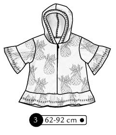 Haut à capuche avec manches courtes à volant et volant à la taille. Fermeture invisible devant, s’enfile par la tête.