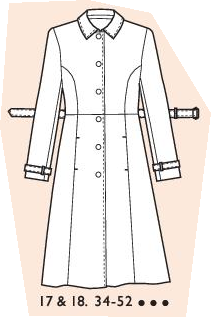 Manteau long avec empiècements princesse devant et dos, poches prises dans la couture de l’empiècement devant, fente dans le bas du milieu dos. Manches en 2 pièces, col avec pied de col, empiècement dos, ceinture ajustable et lien ajustable aux poignets. Boutonnage devant, entièrement doublé
