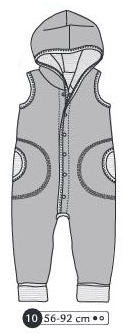 Combinaison manches longues et capuche. Poignets et bracelets de cheville en bord côte, oreilles sur la capuche. Empiècement aux genoux, poche plaquée devant et fermeture à pressions devant