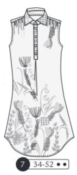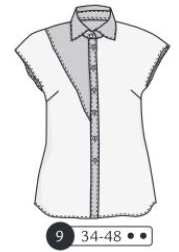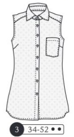 Chemisier sans emmanchure mais manchons, pinces poitrine et épaules dos, découpe devant, col et pied de col. Boutonnage devant