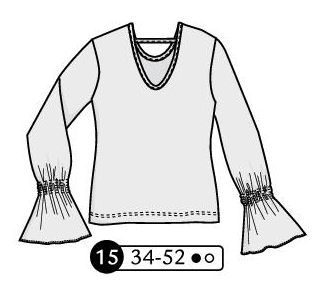 Tunique manches 3/4, col V croisé. Fronces aux emmanchures et sur le haut de la jupe devant et dos. Pinces à l’encolure dos. Bas des manches élastiquées.