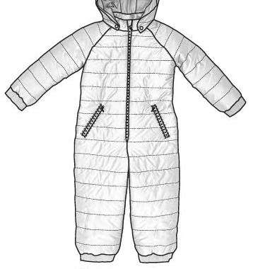 Combinaison manches raglans, fermeture invisible devant. Selon le modèle avec ou sans capuche et avec élastique ou non aux chevilles.