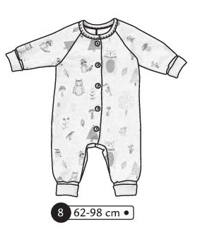 Combinaison manches raglans, poche kangourou plaquée devant, pressions à l’entrejambe. S’enfile par la tête