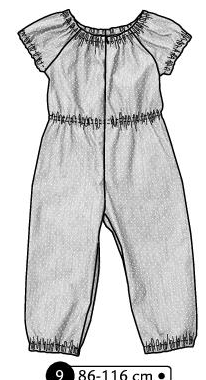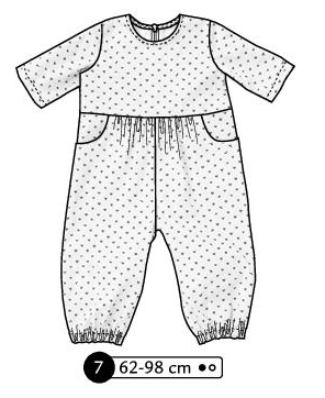 Combinaison en double gaze manches 3/4, poches aux hanches et volants sur le haut devant et dos en passant sur les épaules. Fronce à pantalon devant et dos. Bas des jambes élastiqué, pressions à l’entrejambe. Fermeture invisible au dos.