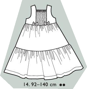 Robe sans manches à volants. Empiècement à smocks devant et dos, nœuds sur le devant.