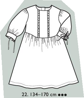Robe courte à manches 3/4 froncées avec empiècement et fente à nouer en bas. Jupe froncée, empiècement devant avec froufrous. Patte de boutonnage au dos