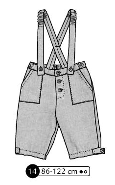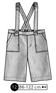 Salopette courte à bretelles. Poches plaquées au dos et aux hanches, fausse braguette avec boutons. Bretelles, ceinture dos et bas des jambes dos élastiqués. Patte boutonnée en bas des jambes et bouton pour fermer les bretelles