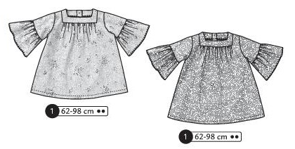 Tunique manches courtes évasées et raglans. Encolure carrée froncée, pinces poitrine et empiècement dos smocké. Jupe froncée