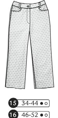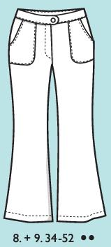 Pantalon élargi aux cheville , poches plaquées aux hanches, braguette avec ceinture et bouton. Pinces devant et dos.