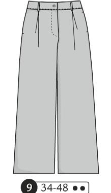 Pantalon large avec plis devant et pinces au dos. Poches dans la couture de côté aux hanches, braguette avec bouton à la ceinture