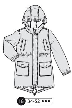 Anorak, veste imperméable à manches raglans et capuche. Poignets élastiqués, un zip de chaque côté de l’encolure, zip de chaque côté dans les couture de côté. Capuche en partie élastique et poche plaquée à rabat devant.