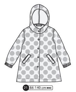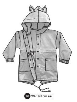Imperméable parka avec manches élastiquées, capuche avec découpes et oreilles de chat. Poches plaquées devant, coulisse à la taille pour resserrer, pressions devant. Petite ouverture en bas dos avec liens pour resserrer