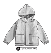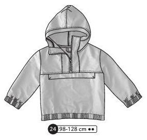 Anorak à capuche et manches raglans. Capuche élastiquée en haut, poche devant et fermeture sur le haut du devant