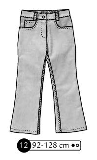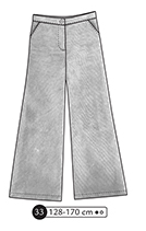 Pantalon élargi en bas des jambes. Poches aux hanches, poches plaquées au dos et empiècement au dos. Braguette, taille élastiquée au dos et boutonnée devant