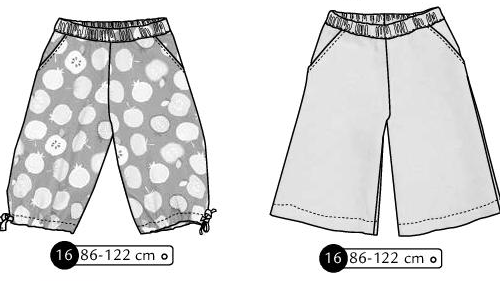 Pantacourt large, taille élastiquée, poches aux hanches et sur un modèle, lien pour resserrer le bas des jambes