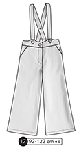 Pantalon large à bretelles croisées dans le dos. Poches aux hanches, braguette et bouton à la ceinture. Taille élastiquée au dos