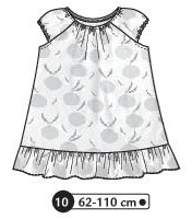 Robe courte en coton avec encolure carrée, fronces devant et dos, manches ballon ou manchons ballon. Jupe froncée avec ou sans lien et nœuds sur les hanches selon le modèle. Fermeture invisible au dos