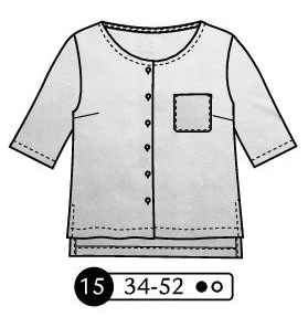 Blouse manches courtes, col arrondi, pinces poitrine, poche plaquée devant. Fente en bas des côtés, dos plus long que le devant et boutonnage devant