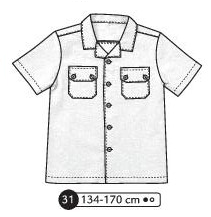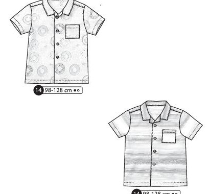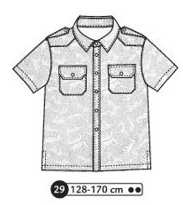 Chemise saharienne, manches courtes, poches plaquées à rabat devant, empiècements épaule avec patte boutonné sur le dessus de l’épaule, petits plus au dos et col avec pied de col. Fente en bas des côtés et boutonnage devant
