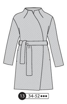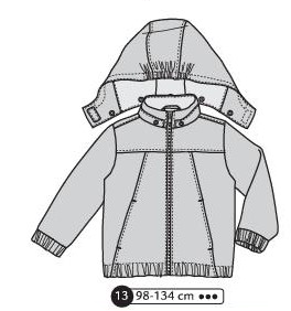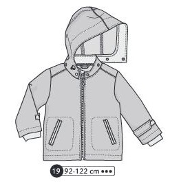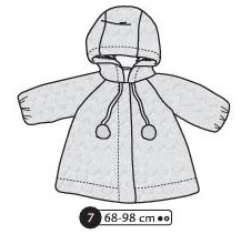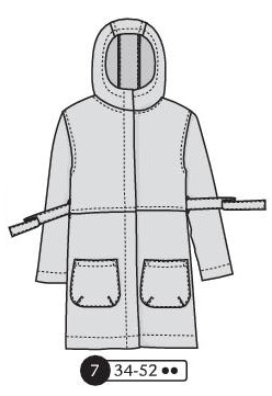 Manteau avec capuche amovible. Ceinture et poignets élastiqués, haut de la capuche devant élastiqué aussi. Poches devant dans les découpes des devant. Empiècement dos, fermeture éclaire devant
