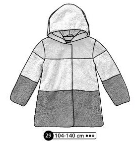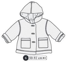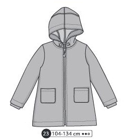 Manteau à capuche avec découpes linéaires. Poches dans une des découpes devant. Boutonnage par pressions devant
