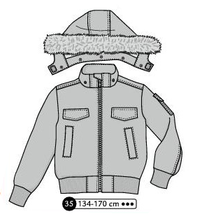Manteau court avec capuche amovible et fausse fourrure amovible à la capuche. Poches à revers et rabats devant, poignets et ceinture en bord côte. Poche sur une manche. Fermeture devant et empiècement dos
