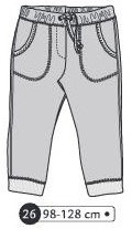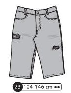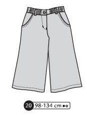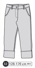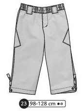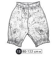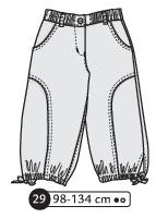 Pantacourt avec braguette et bouton à la ceinture, poches aux hanches. Empiècement jambe devant, poches plaquées au dos. Taille en partie élastiquée, bas des jambes élastiquées avec fente et nœud