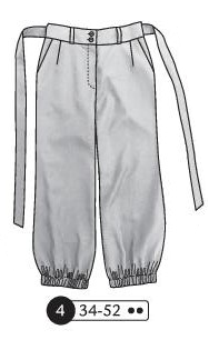 Pantacourt à pinces devant et dos, bas des jambes élastiqués, poches aux hanches, poches à revers au dos. Braguette et boutons à la ceinture et ceinture à nouer