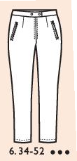 Pantalon à plis devant, braguette et bouton à la ceinture. Poches aux hanches, bandes le long des jambes sur les côtés, taille élastiquée au dos, poche passepoilée au dos.