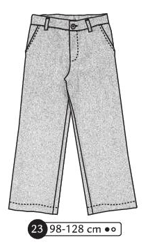 Pantalon avec poches aux hanches, poches plaquées au dos, empiècement dos. Braguette et bouton à la ceinture