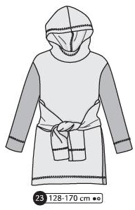 Robe ou pull selon la manière dont le modèle est porté. Robe à capuche et manches longues, manches supplémentaires à la taille. Pull avec manches sur les épaules et capuche et supplément de tissu au niveau du coup.
