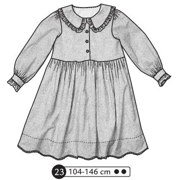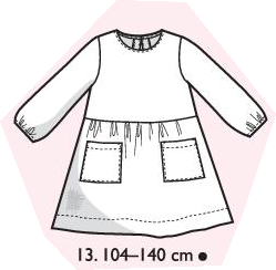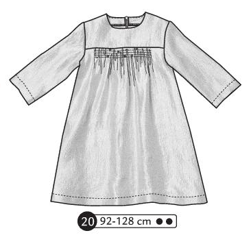 Robe manches longues avec fronces à l’emmanchure et aux poignets. Fronces sur la jupe devant et dos. Bride et bouton pression au dos