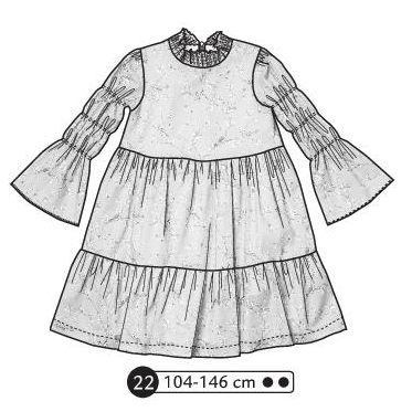 Robe à volants, manches 3/4 raglans resserrées par un lien. Fente à l’encolure devant et resserrée avec un lien.