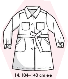 Robe chemise ou veste légère en coton. Manches longues avec fente et pli aux poignets, poches plaquées devant, empiècement dos. Devant et dos coupés au niveau de la taille, pinces et poches plaquées au dos. Patte de boutonnage devant, ceinture amovible, col simple.
