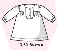 Robe courte en coton, à manches longues froncées avec plis et fentes aux poignets. Empiècements avec patte de boutonnage devant, fronces devant et dos sous les empiècement épaules.