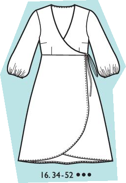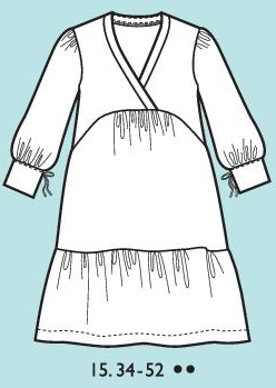 Robe courte à manches 3/4, fronces et empiècements de poignet à fente agrémenté d’un lien. Col V croisé, pinces à l’encolure dos, fronces sur les jupes devant et dos. volant froncé en bas de la robe.