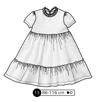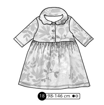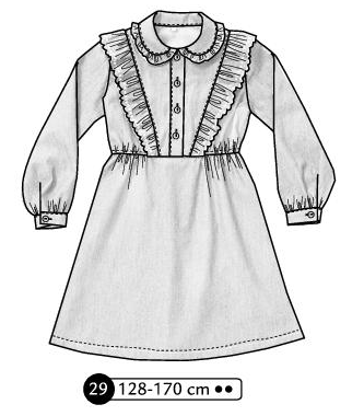 Robe courte en coton à manches longues. Fronces, fente et bouton aux poignets. Fronces à la taille, col claudine avec froufous sur le bord. Volant sr le devant et dos en passant par les épaules. Boutonnage devant sur le haut