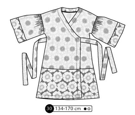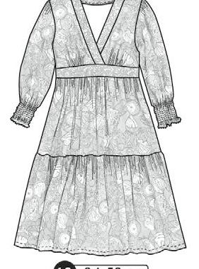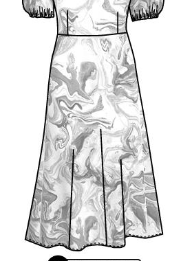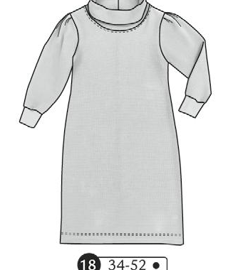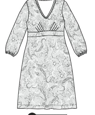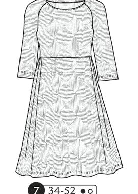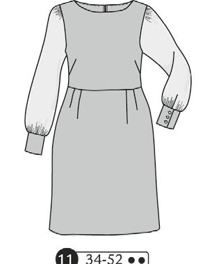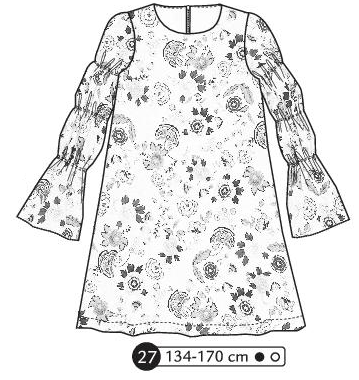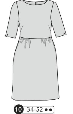 Robe courte manches 3/4 avec petite fente en bas. Pinces sous poitrine, fronces aux hanches de la jupe, poches dans la couture de côté aux hanches. Fermeture invisible au dos et petites pinces à l’encolure dos