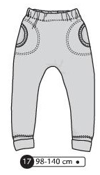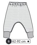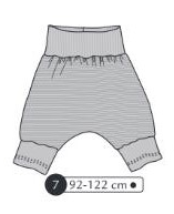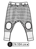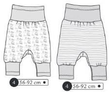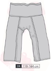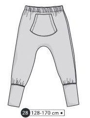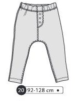 Pantalon type sarouel sans couture de fourche. Ceinture en bord côte. Avec ou sans pieds selon l’option choisie