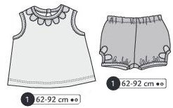 Débardeur et bloomer en jersey avec appliqués fleurs et goutte d’eau, dans le dos du débardeur avec bouton pour fermer et sur les côtés des cuisses pour le bloomer. Taille élastiquée et froncé aux jambes.