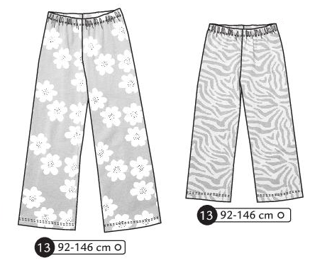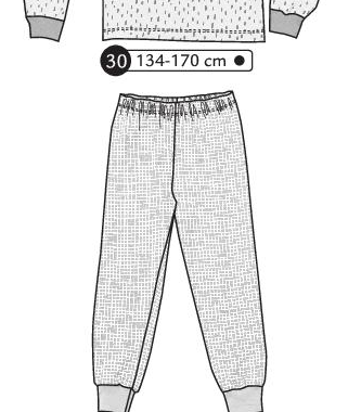 Pyjama avec pantalon taille élastiquée, bord côte aux chevilles. Haut manches longues raglans avec pinces aux épaules, bord côte aux poignets et encolure