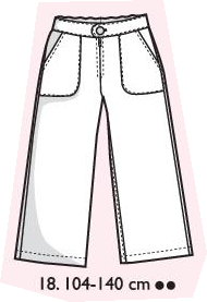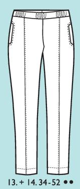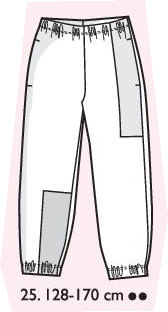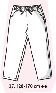 Pantalon avec taille élastiquée, poches aux hanches et plis tout le long du devant des jambes. Légèrement resserré aux niveau des chevilles