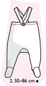 Pantalon à bretelles et pieds. Bretelles croisées au dos et réunies en V avec un bouton devant. Taille élastiquée