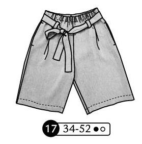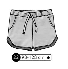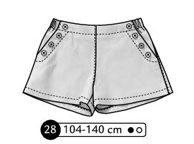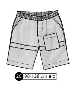Bermuda avec poches aux hanches, poches plaquées au dos et une autre devant. Bande d’empiècement sur le devant des jambes. Fausse braguette et taille élastiquée