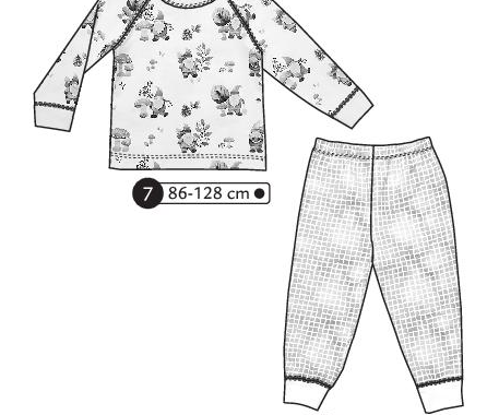 Pyjama avec pantalon taille élastiquée, bord côte aux chevilles. Haut avec manches longues raglans et pinces sur les épaules. Bord côte aux poignets et encolure
